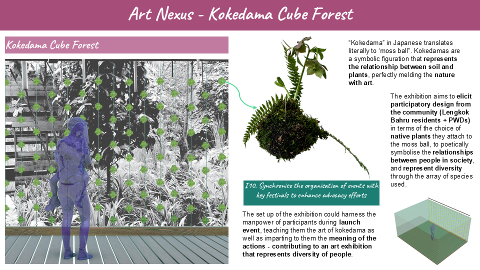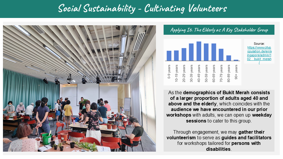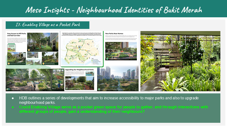 Design for placemaking in tandem with the concept of “city living close to nature” which is the spatial identity used to describe Bukit Merah. We propose a series of strategies to activate green spaces and heritage elements to increase connection between people, the neighbourhood and Enabling Village.