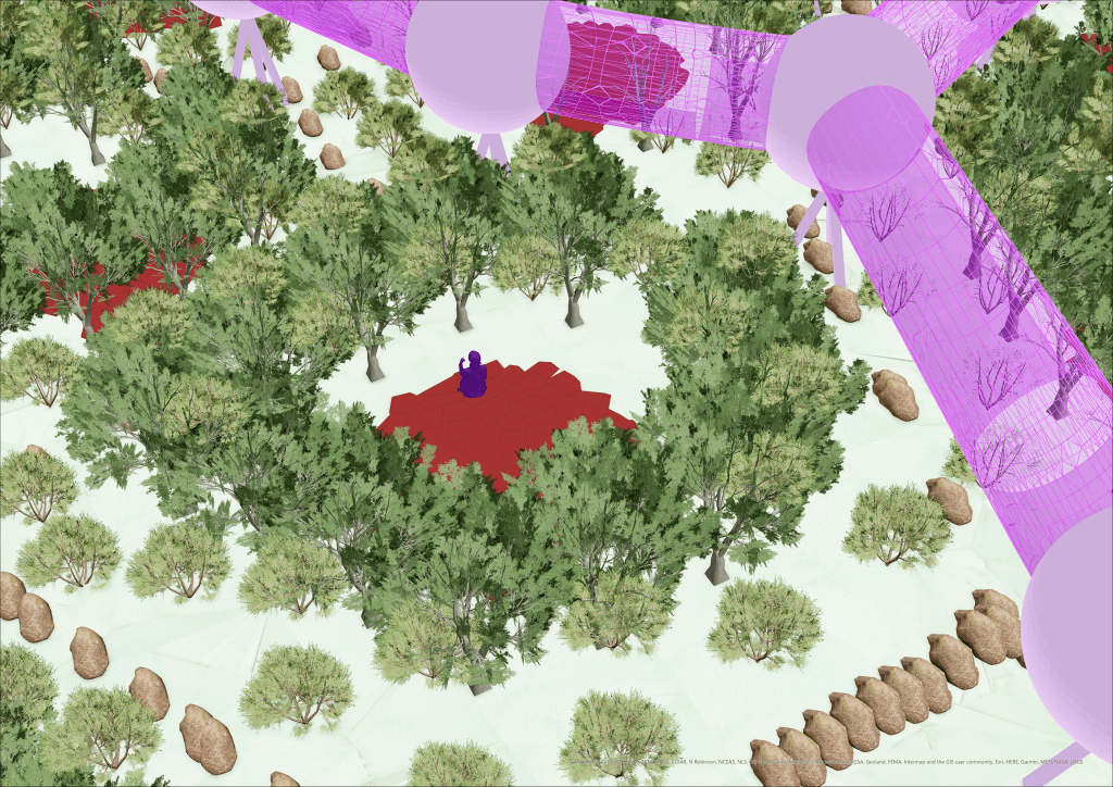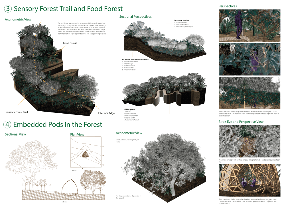Flow aims to insert biophilic play into the existing landscape, restoring swamp forests of the past through seed scattering, seed-bombing and planting activities. The extracted concepts of ‘protector’, ‘floating islands’ and ‘ nature’s cradle’ from the study of Ha Long Bay , are abstracted and infused into the design through a range of typologies manifested at varying scales.