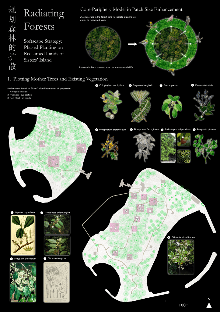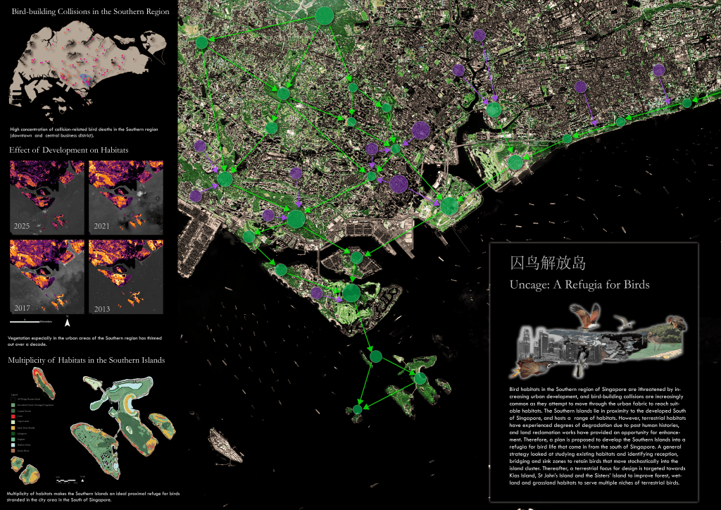 Bird habitats in the Southern region of Singapore are threatened by increasing urban development, and bird-building collisions are increasingly common as they attempt to move through the urban fabric to reach suitable habitats. The Southern Islands lie in proximity to the developed South of Singapore, and hosts a range of habitats. However, terrestrial habitats have experienced degrees of degradation due to past human histories, and land reclamation works have provided an opportunity for enhancement. Therefore, a plan is proposed to develop the Southern Islands into a refugia for bird life that come in from the south of Singapore. A general strategy looked at studying existing habitats and identifying reception, bridging and sink zones to retain birds that move stochastically into the island cluster. Thereafter, a terrestrial focus for design is targeted towards Kias Island, St John’s Island and the Sisters’ Island to improve forest, wetland and grassland habitats to serve multiple niches of terrestrial birds.