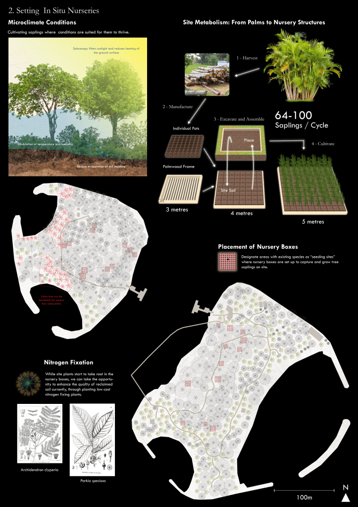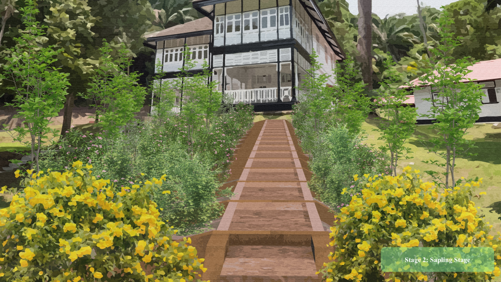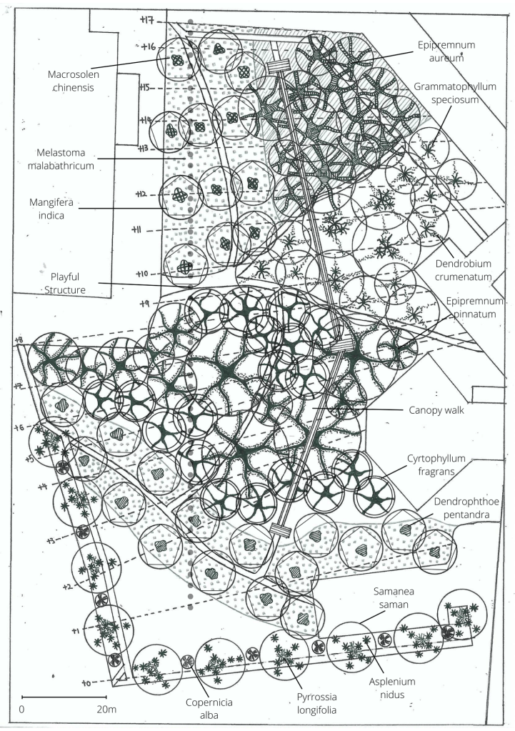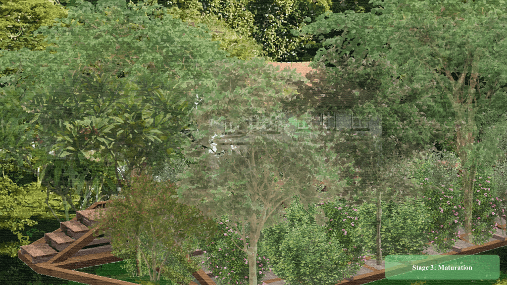 Design gestures involve modifications to topography, built forms, hardscapes and plant placements. The design features mainly centre around a nursery that forms the main ‘floating island’ which protects people and plants from the elements. A connecting node serves to connect people to the board walk, canopy walk and the ground paths that form when the water shed is not flooded (normally dry conditions). The labyrinth forest with its log islets and canopy walk serves to provide different experiences – navigating through the forest through stepping stones, forced to flow through the landscape aloft and to seek seclusion in enclosed spaces.